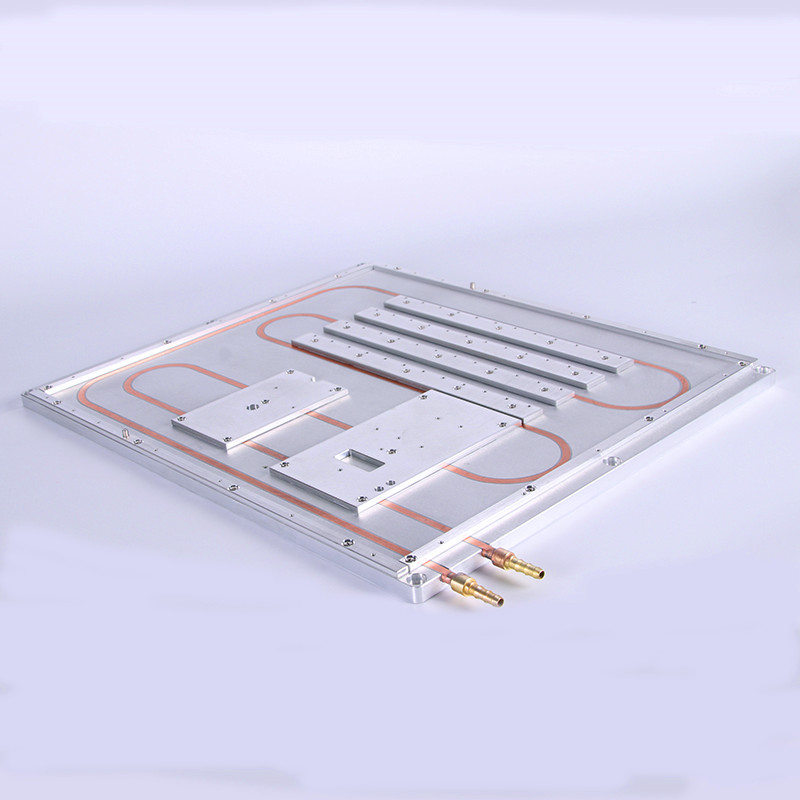 在間接液體冷卻中,冷卻劑與電子裝置不是直接接觸,而是安裝在液體冷卻的水冷板上。 這種水冷板作為安裝電子設(shè)備的底盤,也是一種換熱器。 熱量通過裝置到冷板的自由對流,傳導(dǎo)或輻射,然后從冷板到冷卻液,熱量被冷卻液帶走.. 根據(jù)電子設(shè)備的結(jié)構(gòu)要求可設(shè)計(jì)成多種形式的冷板.. 為了使間接液體冷卻效果顯著,必須降低熱流路徑中的三種熱阻。 一,降低裝置與殼體(冷板)接觸熱阻,安裝表面必須平整,光滑,清潔,并有足夠的壓縮力,最好在接觸表面之間填充導(dǎo)熱潤滑脂;二,降低導(dǎo)熱電阻,冷卻管必須盡可能靠近加熱裝置,縮短導(dǎo)熱路徑,盡量使用導(dǎo)熱系數(shù)高的鋁或銅作為殼體(冷板)材料;第三,降低管道與冷卻劑之間的對流傳熱熱阻,可以增加管道中冷卻劑的流動(dòng),改變流動(dòng)狀態(tài)等。對于間接液冷設(shè)備,可以考慮采用深圳市管熱科技有限公司的水冷板,綜合考慮以上情況,由熱仿真工程師進(jìn)行合理設(shè)計(jì),選擇攪拌摩擦焊水冷板,或埋銅管水冷板,或真空釬焊水冷板。